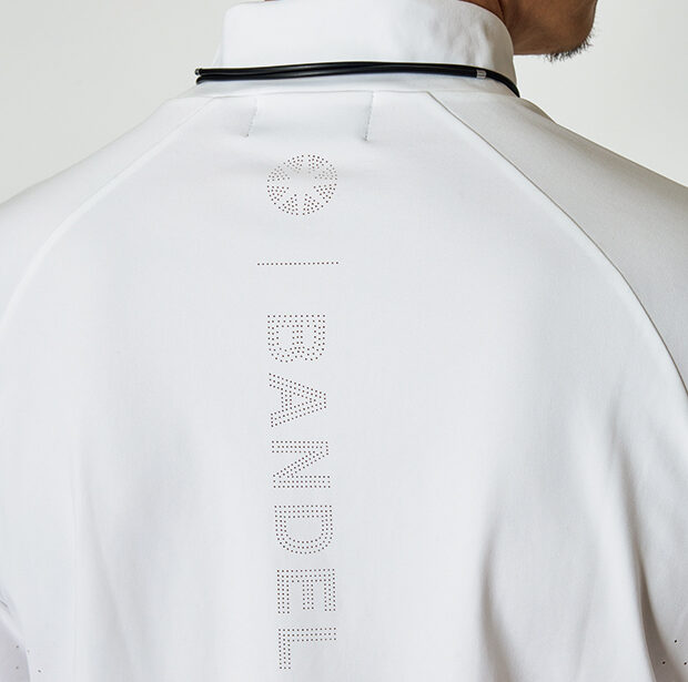 軽量で柔らかな素材を使用したモックネックシャツはバックロゴをヒートパンチング加工で表現。通気性とデザイン性を兼ね備える。