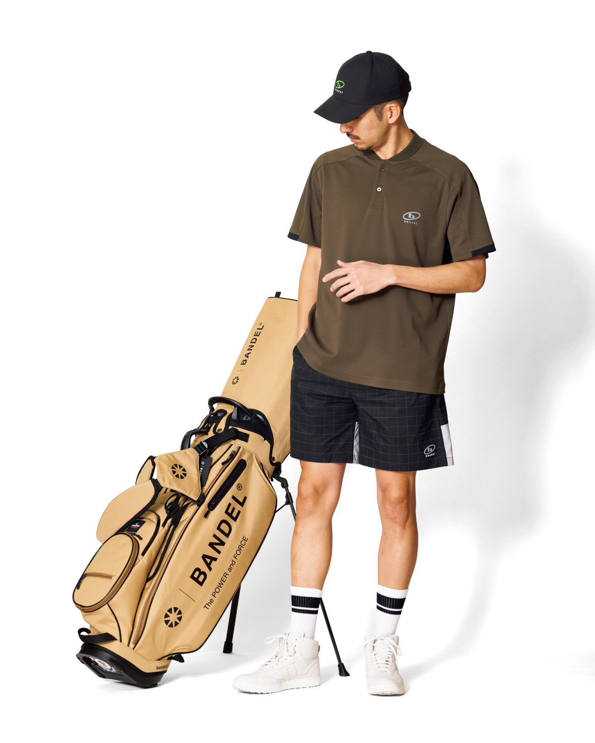 カーキのポロシャツにブラック×グレーのウィンドウペン柄ショーツを合わせ、都会的な印象に。程よいアクセントのダイアゴナルロゴ、ベージュのコラボキャディバッグで上品さと統一感を演出。キャップ¥11,000、ポロシャツ¥25,300、パンツ¥33,000、ソックス¥3,850(すべてバンデル)、キャディバッグ¥93,500(エリートグリップ×バンデル)、その他 スタイリスト私物