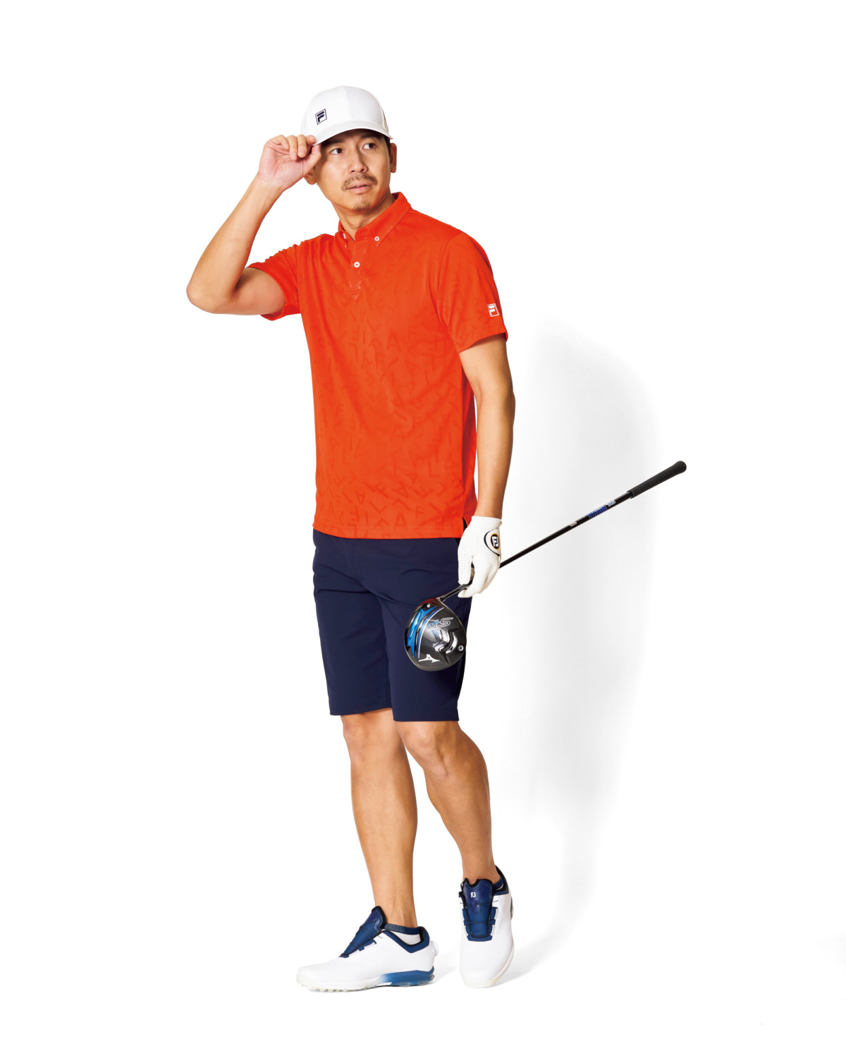 盛夏のコースに映えるパキっとしたオレンジのジャカードポロシャツを際立たせるのは、ネイビーのショーツとのコントラスト。ホワイトのキャップを合わせることで、インパクトのあるカラーポロシャツに抜け感と涼しげな印象をプラスしたスタイリング。キャップ¥2,640、ポロシャツ¥8,690、ショーツ¥8,690(すべてフィラ)、その他 スタイリスト私物