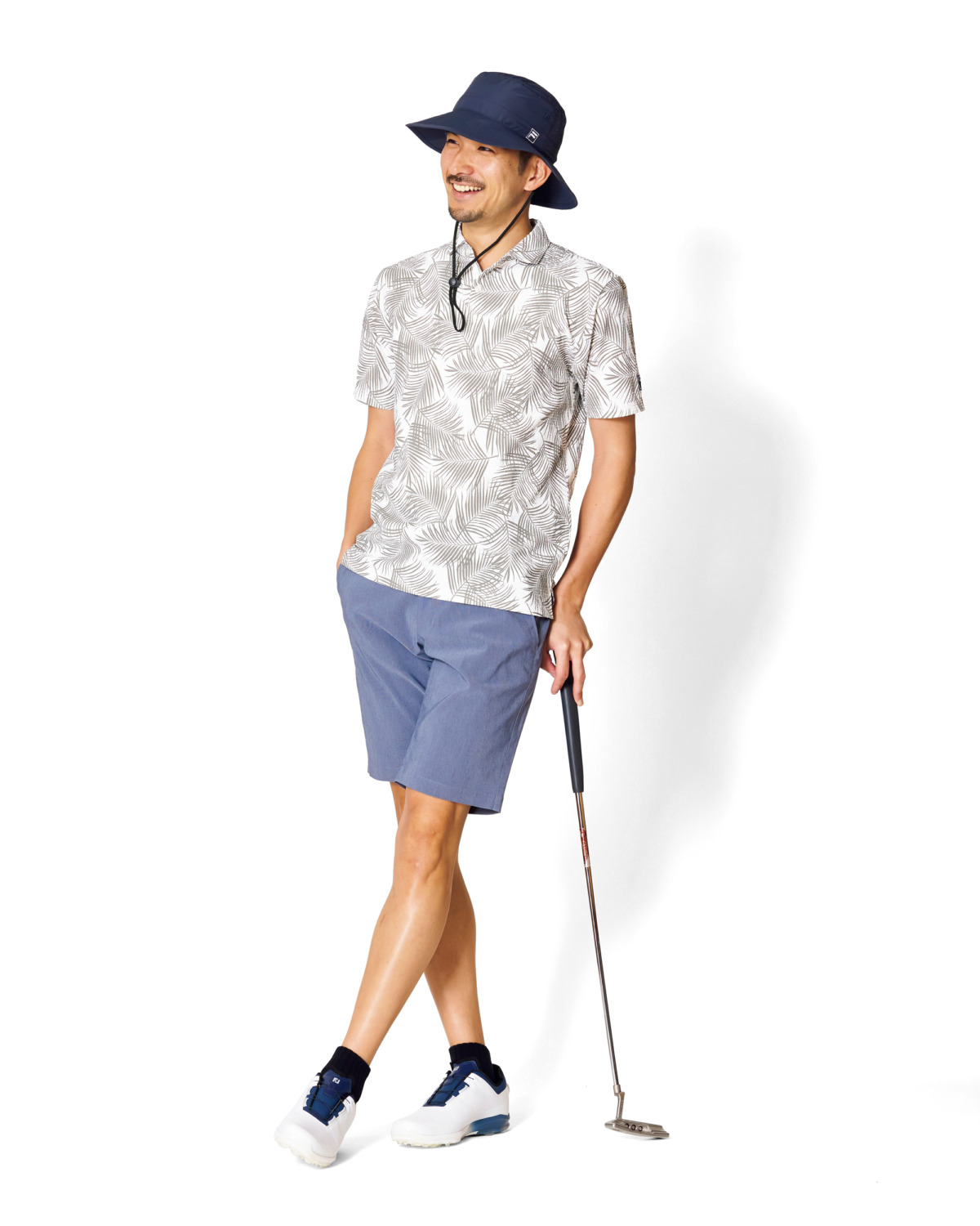バイアスのレタリングプリントが全面に施されたポロシャツに、トップスプリント柄とリンクする色味のシンプルなショーツを合わせてスッキリまとめ、夏ゴルフを快適に楽しむスタイリング。トレンド感のあるハットを合わせることで、程よいカジュアル感も演出する。ハット¥4,950、ポロシャツ¥9,350、ショーツ¥7,150(すべてフィラ)、その他 スタイリスト私物
