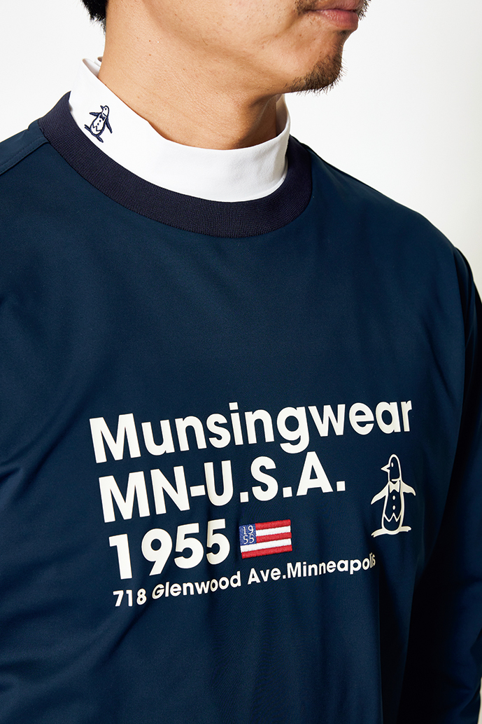 襟にアイコンのリトル・ピートを配したモックネックに、撥水性やUPF50+の紫外線カットを備えるスウェットをレイヤード。