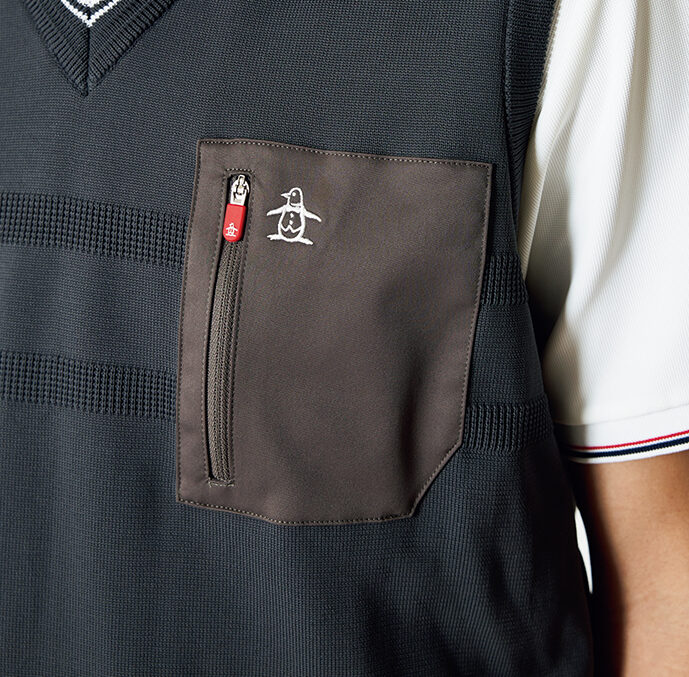 ポリエステル糸を使用した軽やかな着心地のニットベスト。シンプルながら異素材をポケットに使用したハイブリッドなデザインがポイント。