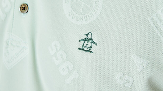 ポロシャツにはオリジナルのロゴを散りばめて立体的に表現したジャカード素材を使用。少しゆったりとしたシルエットが特徴の一枚。