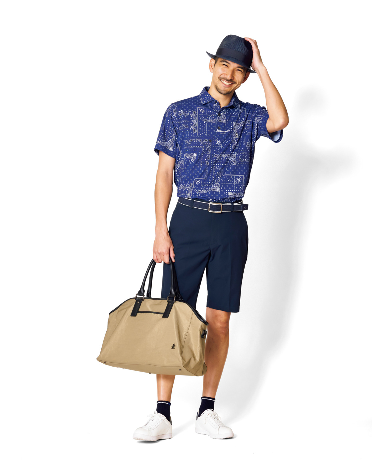 キャッチーなバンダナ柄のポロシャツをメインとして、落ち着いた印象のネイビーカラーでまとめた機能性に優れた盛夏スタイル。ハットをチョイスすることで一段上の大人っぽさを演出。ハット¥10,560、ポロシャツ¥19,800、ショーツ¥18,700、ベルト¥9,460、ソックス¥2,090、シューズ¥33,000、ボストンバッグ¥37,400(すべてマンシングウェア)、その他 スタイリスト私物