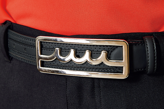 2000年代初頭を思わせるバックルベルトもスタイリングに欠かせない重要なアクセントの一つとして存在感を放つ。