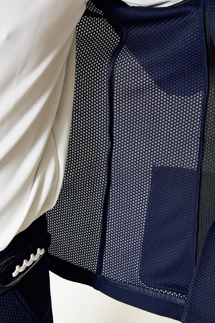 通気性に優れた清涼感のあるメッシュ素材を使用したセットアップは、真夏でも日差しを直接浴びない分、涼しく感じる。
