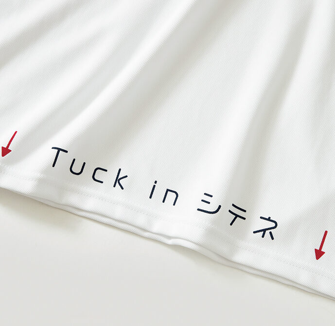 タックインを目的として作られたポロシャツ。「Tuck In シテネ」とプリントされた長い裾は、スイングしても絶対に出ない仕様。