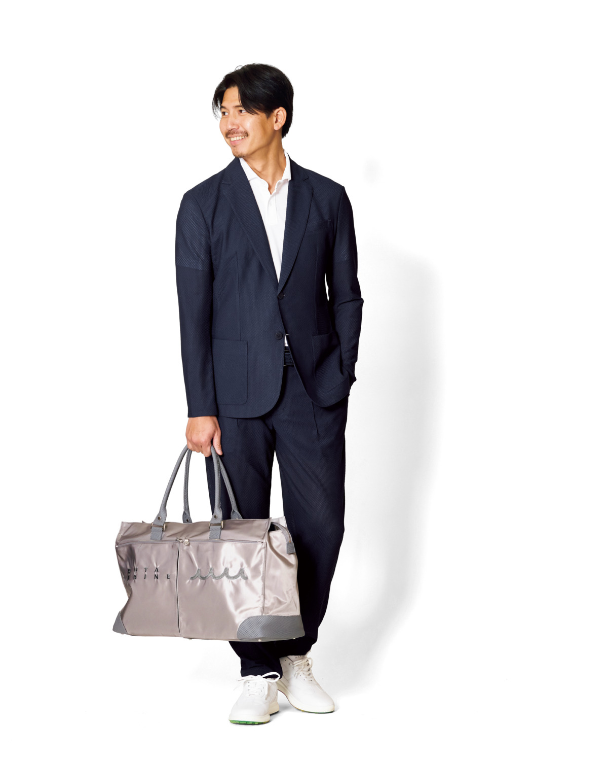 ゴルフの行き帰りやコンペの表彰式、カジュアルなビジネスシーンなどに対応するセットアップスタイル。高品質エシカルレザー「コンティニュア」とリモンタナイロンを合わせたボストンバッグも秀逸。ジャケット¥39,600、ポロシャツ¥22,000、パンツ¥29,700、ベルト¥17,600、シューズ¥39,600、ボストンバッグ¥49,500(すべてムータ・マリン)、その他スタイリスト私物