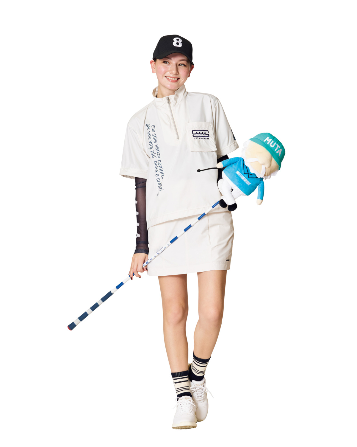 高級感のある光沢や滑らかな肌触り、軽量で耐久性にも優れた高品質ナイロン生地を使ったセットアップ。シアーモックネックインナーとの組み合わせでトレンド感も加わります。キャップ¥9,900、ハーフジップブルゾン¥39,600、シアーインナー¥14,300、スカート¥34,100、ソックス(3足セット)¥13,200、シューズ¥39,600、ヘッドカバー[Dr]¥19,800(すべてムータ・マリン)