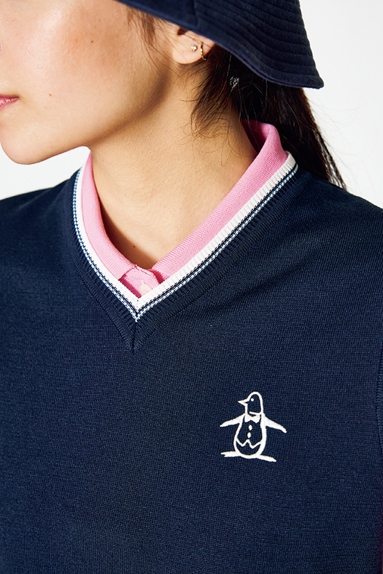 アーガイル柄の白ボディにピンクのパイピングが効いたニットベスト。スタイリングにフェミニンでキュートなエッセンスをプラスしてくれます。