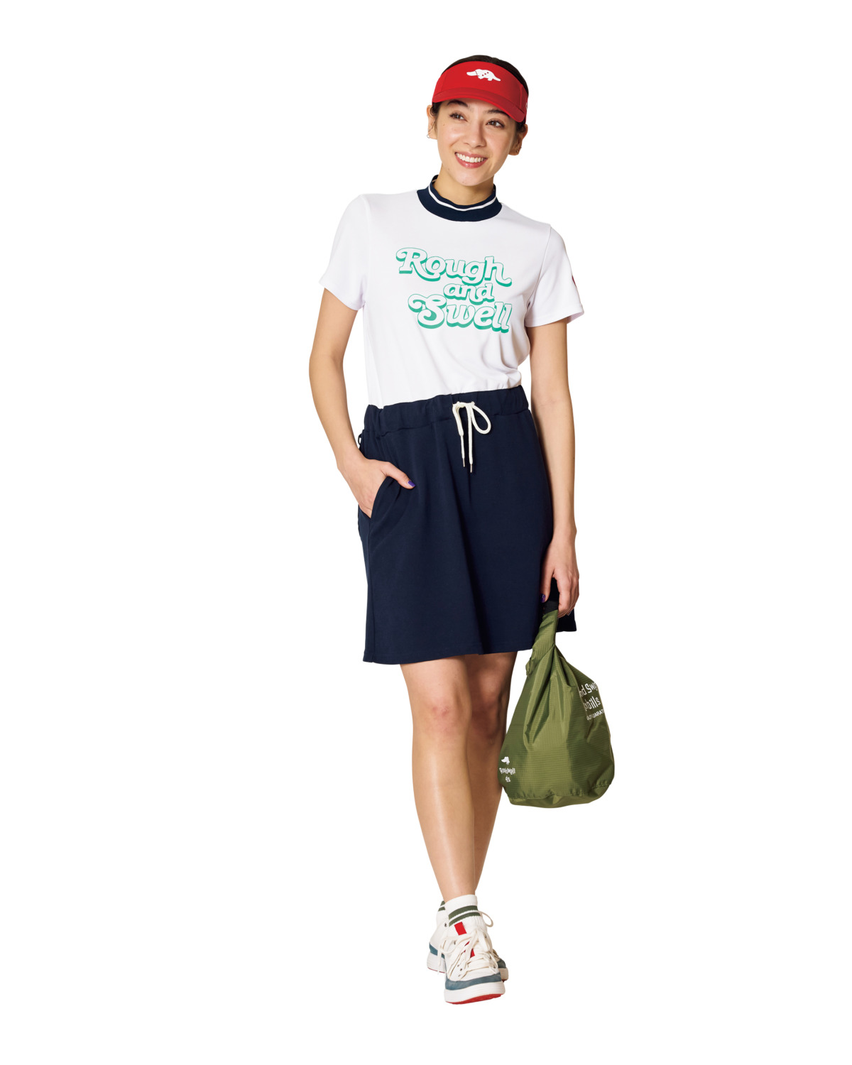 ハンバーガー柄を一層引き立たせる“柄×無地”のラウドマウス王道コーディネート。トップス袖のメッシュレースが女性らしさをプラス。それぞれのアイテムの個性を活かしたスタイリングです。サンバイザー¥4,950、ポロシャツ¥13,200、スカート¥12,100、ソックス¥1,650、シューズ¥10,780、カートバッグ¥7,700(すべてラウドマウス)、その他スタイリスト私物