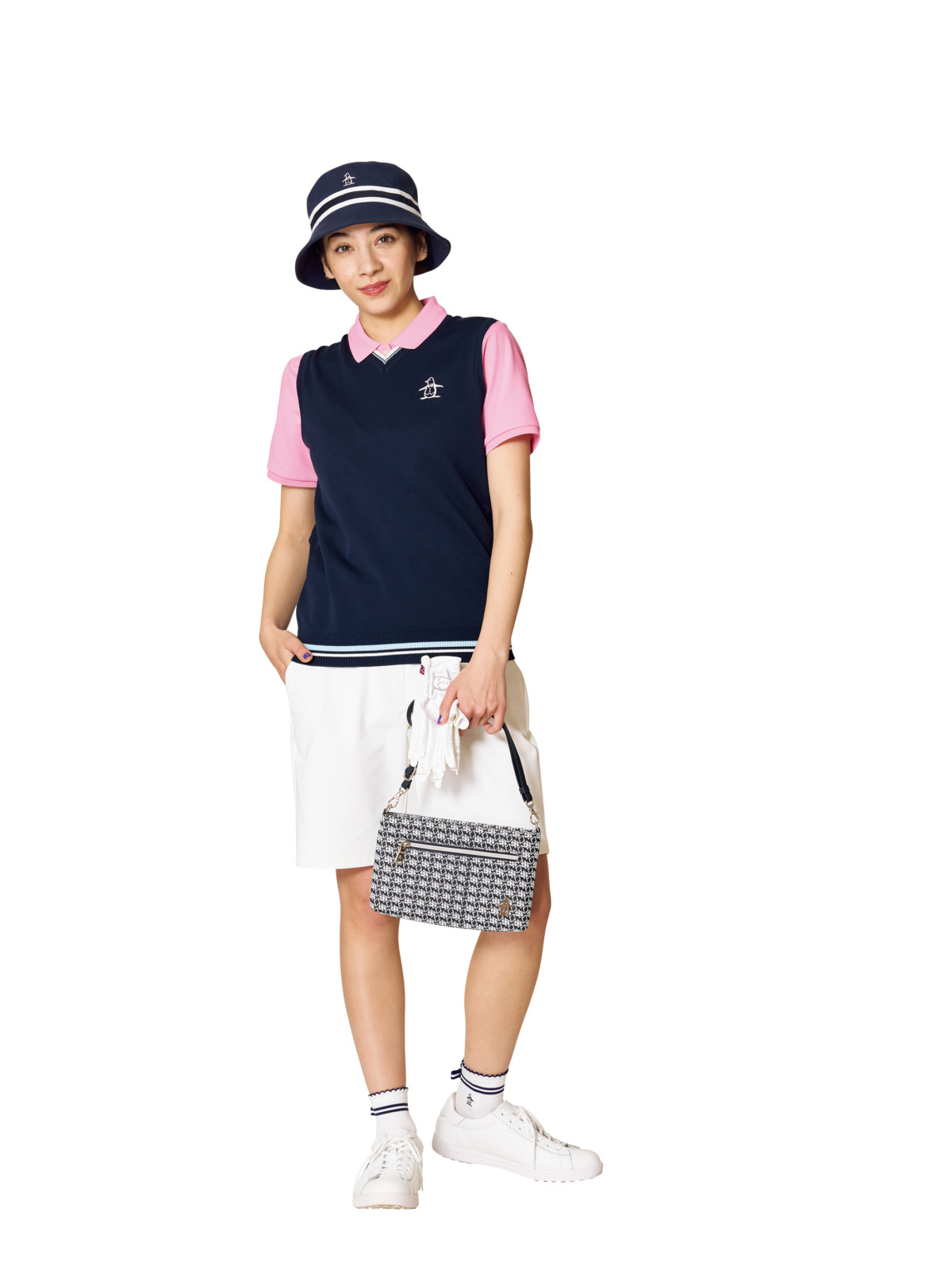 ニットベストを主役にしたベーシックなアイテム合わせに、総柄マルチポーチで少しだけ個性をプラス。上品さが溢れるオーセンティックな大人のスタイリング。ハット¥7,480、ニットベスト¥19,800、ポロシャツ¥16,500、ハーフパンツ¥22,000、ソックス¥2,200、シューズ¥33,000、グローブ¥7,700、ポーチ¥11,000(すべてマンシングウェア)、その他スタイリスト私物