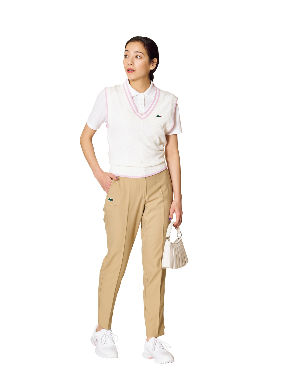 新色ピンクのニットポロはブランド創設時からゴルフにルーツを持つラコステならではの、クラシックで上品なスタイリングを叶えるアイテム。スカート見えするショートパンツを合わせたクリーンな着こなしです。サンバイザー¥8,690、ニットポロシャツ¥19,800、ショートパンツ¥15,400、ソックス¥1,870、シューズ¥22,000(すべてラコステ)、その他スタイリスト私物