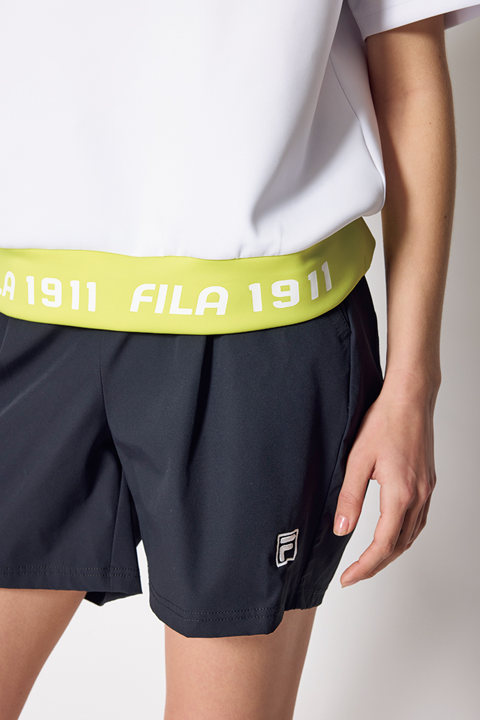 少しゆとり感を持たせたモックネックシャツにショートパンツを合わせた、リラックス感のあるスタイリング。シンプルすぎる印象を与えないように取り入れた、モックネックシャツの裾とキャップのイエローが差し色としてアクセントになっています。キャップ¥4,950、モックネックシャツ¥8,690、ショーツ¥9,790(すべてフィラ)、その他スタイリスト私物