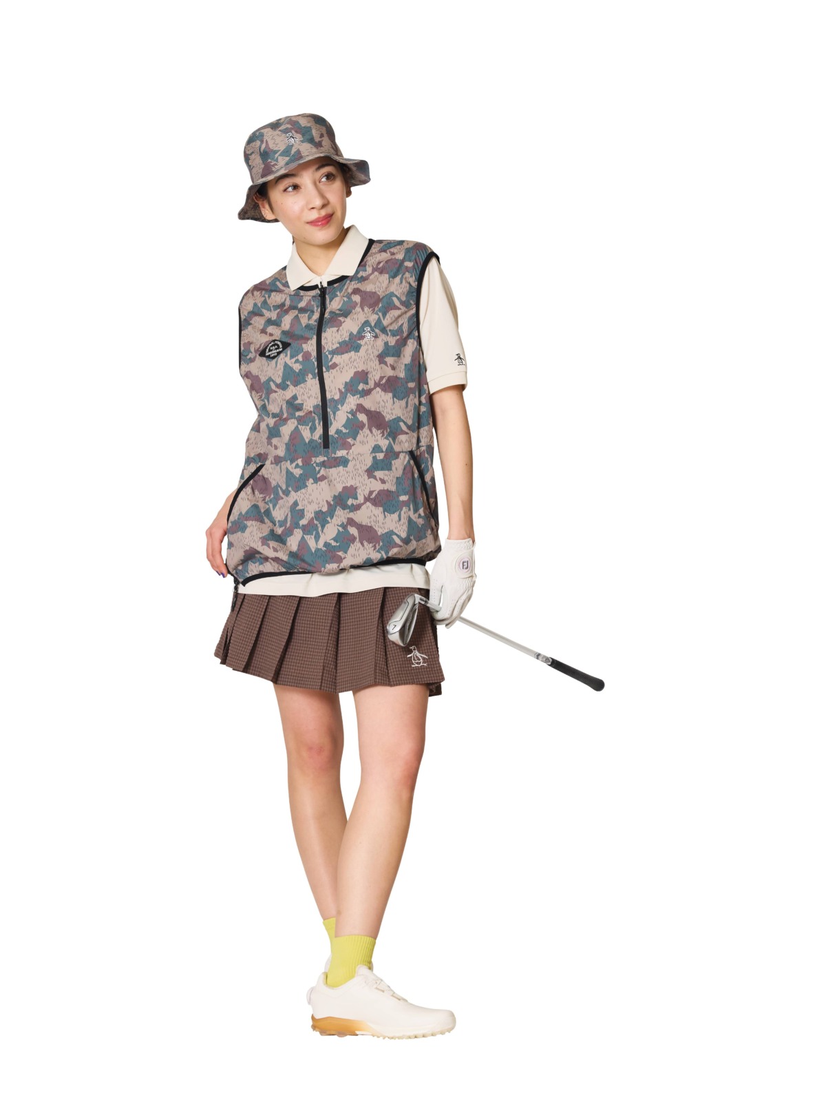 ハットとベストはポリエステル100%の同素材を使用。ソフトでしなやかな肌触りが特徴で、軽量感とストレッチ性もあり、小雨程度であれば対応できる撥水機能も備える。夏ゴルフをアースカラーでまとめた斬新さが際立つスタイリング。ハット¥9,350、ベスト¥17,600、ポロシャツ¥15,950、スカート¥19,800、ソックス¥2,200(すべてペンギンバイマンシングウェア)、その他スタイリスト私物