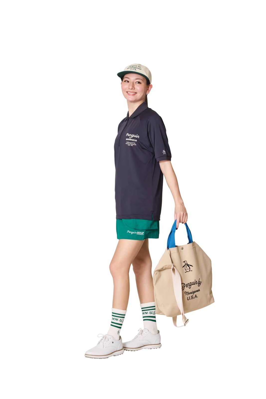 コースのグリーンに映える鮮やかなグリーンのスカートをメインにした夏のゴルフコーデ。スマートな印象のハーフジップシャツに2トーンキャップを合わせてアメリカテイストをプラス。キャップ¥7,150、ハーフジップシャツ¥15,950、スカート¥19,800、2パックソックス¥5,280、トートバッグ¥8,580(すべてペンギンバイマンシングウェア)、その他スタイリスト私物
