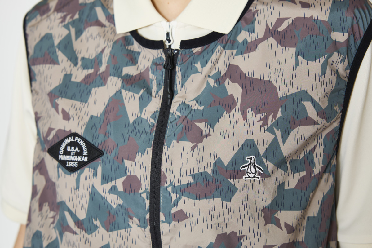 ペンギンかも!? なカモフラージュ柄。ストリート感のあるハット&ベストをよく見ると、カモフラージュ柄の中にペンギンが。
