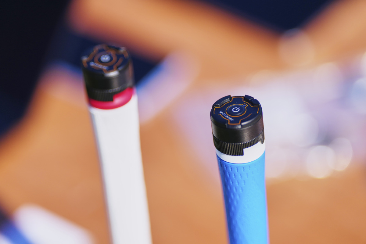 グリップエンドに装着したデバイスがスイングを解析し、AIアプリが改善点をアドバイスする「M-Tracer」。