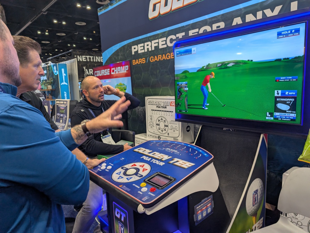 実在するコースも収録したPGA公式アーケード用ゴルフゲーム「Golden Tee PGA TOUR」。家庭用も用意。