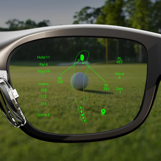 光学系「ZEISS LENSES」を採用するゴルフ専用の高性能サングラスが発表した「Smart AR Glasse」。高輝度LEDディスプレイにスマホ連動でヤーテージを表示するほか、音声通話用マイク、21言語の翻訳機能を搭載。44gと軽量。