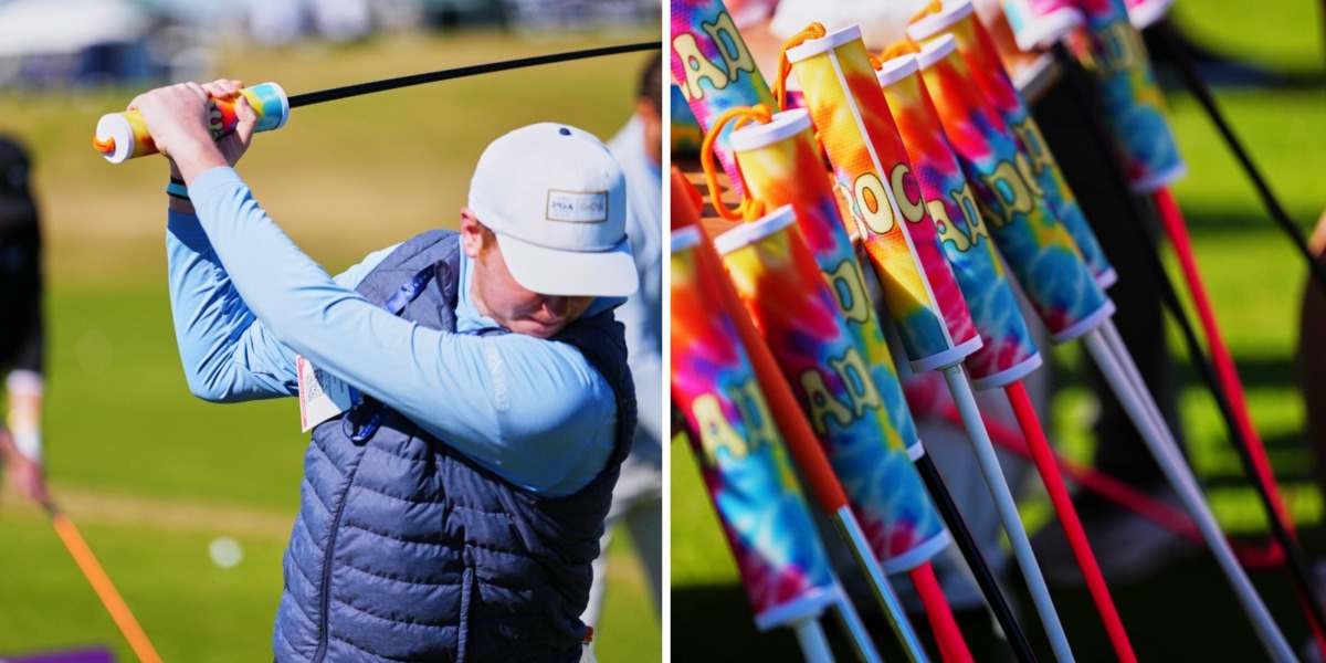 握りきれないほどの極太グリップにより手首の無駄な動きを抑制し、大きな筋肉によるスイングを促し、安定性と方向性を向上させる練習器具『カデロゴルフグリップ』をお披露目。極彩色の存在感もグッド!