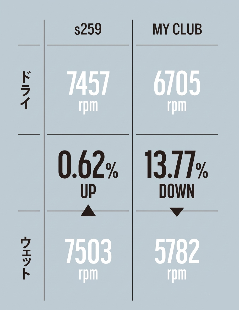 一般に水滴や芝などがフェースに付着すると摩擦係数は下がり、スピン量は減少する。その通りの結果を示したマイクラブに対し、s259はウェット下でもスピンが減らないどころかドライ下での数値を上回る逆転現象が発生。