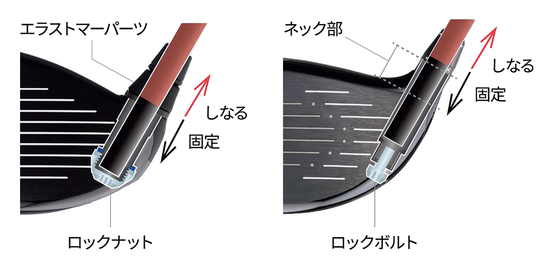 さらにこのスリーブ機構はドライバーにおいてインパクト時にシャフトとヘッドの接合部が打点より低くなり、高打出しとギア効果によるバックスピン抑制効果をもたらす設計を可能にした。(特許出願中)。
