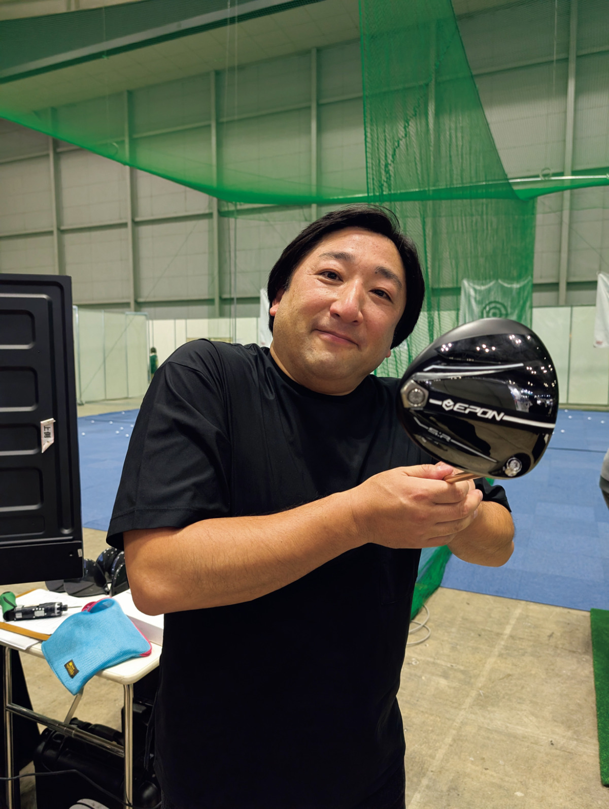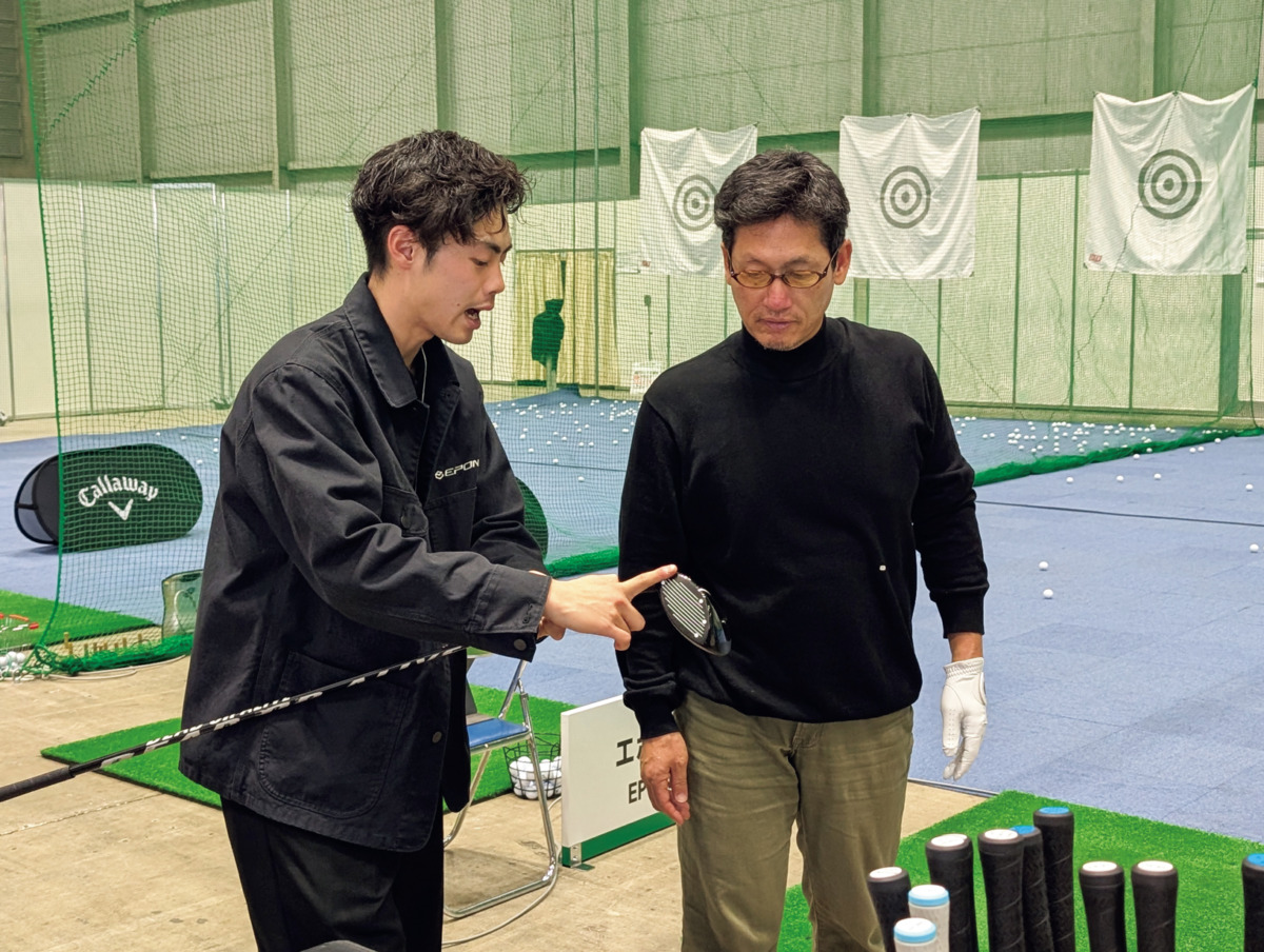 元編集部員のクモンもエポンの新技術に刮目。「黒いヘッドの見た目の格好良さは流石エポン。#5アイアンを試したら、普段通り振っても打ち出しが高く、打てそうな感触。ロフト角が23°と後で聞いて驚きました」。