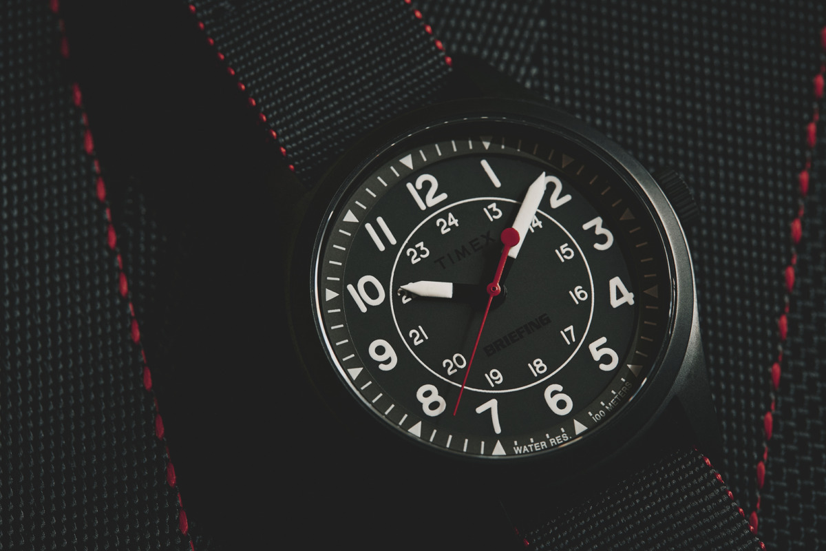 フィールドウォッチの王道を踏襲したデザインは、アウトドアや軍用の実用性をベースに、日常使いも可能なミニマルな外観に仕上がっている。時計本体にはビードブラスト製法を施し、光沢を抑えたマットな質感を実現。文字盤に配されたTIMEXとBRIEFINGのロゴも半マット仕上げとすることで、主張しすぎない上品な佇まいを演出している。