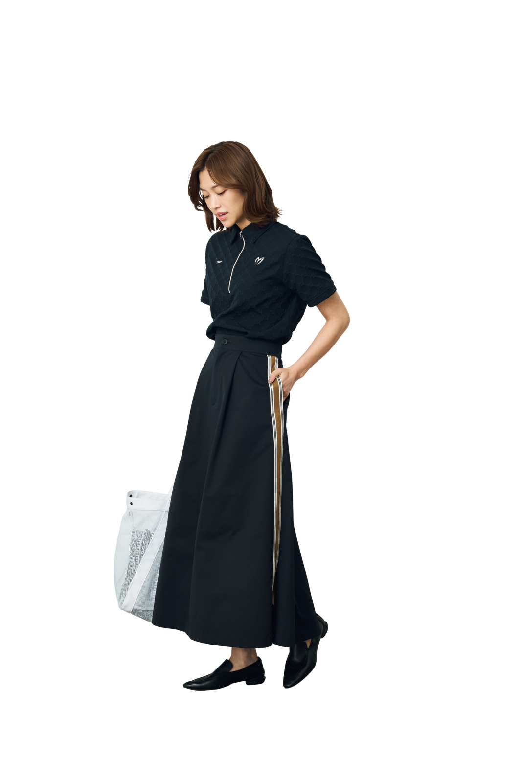 定番モノトーンスタイルはシルエットで差別化するとグッと洒脱に。英国伝統のスタイルを思わせるロング丈スカートとアスリートなトップスでAラインシルエットを構築すれば、モードな佇まいに。スカート41,800円(アドーア問アドーア)、ポロシャツ22,000円、バッグ24,200円(ともにマスターバニーエディション問マスタバニーエディション)、その他スタイリスト私物
