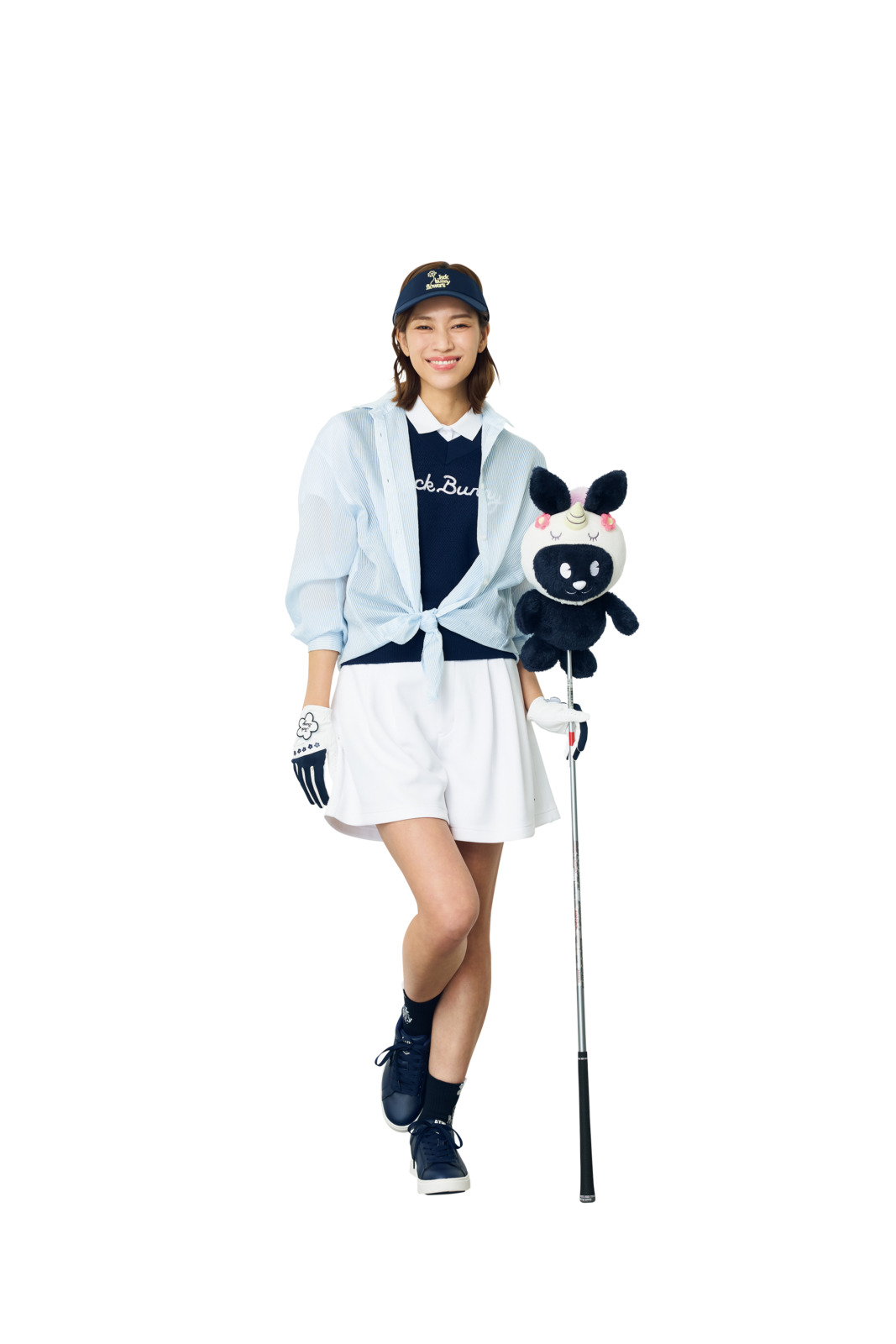 色数を抑えた上品スタイルも、透け感と光沢感のあるオーガンジーのような生地感のシャツを羽織ってお腹で結べば、お洒落で甘めな女性らしい着こなしに。ぬいぐるみヘッドカバーなど小物使いも忘れずに。シャツ6,490円(フリーズマート問フリーズマート)、サンバイザー5,060円、ニット15,400円、ポロシャツ13,200円、パンツ17,600円、グローブ5,720円、ソックス2,200円、靴17,600円、ヘッドカバー12,650円(すべてジャックバニー!!問ジャックバニー!!)