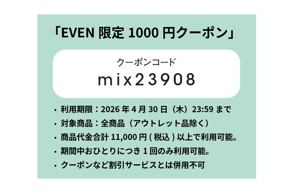 サイトオープン1周年を記念し、今回EVEN読者限定でmix.tokyoで使用できる1,000円クーポンをプレゼント中だ。他のクーポンとの併用は不可だが、アウトレット品を除く全商品を対象に、商品代金が11,000円以上で使用できるため、春のゴルフシーズンに向けたゴルフウェアの新調にぜひ活用してみてほしい。