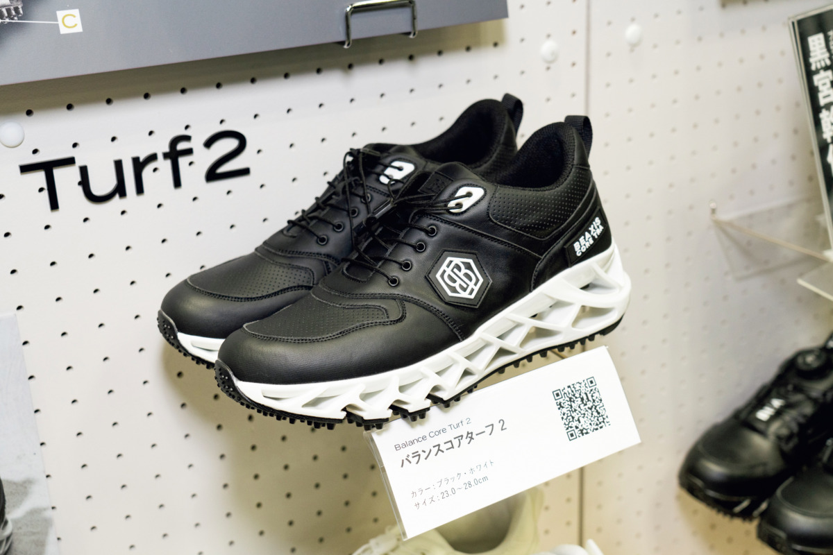5月発売予定「バランスコアターフ2」も展示&試着可。履くだけで体幹をサポート。普段使いにもハマる一足だ。
