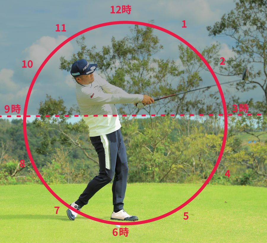 バックスイングで9時から上、フォローで3時から上はクラブが惰性で動くのが理想。