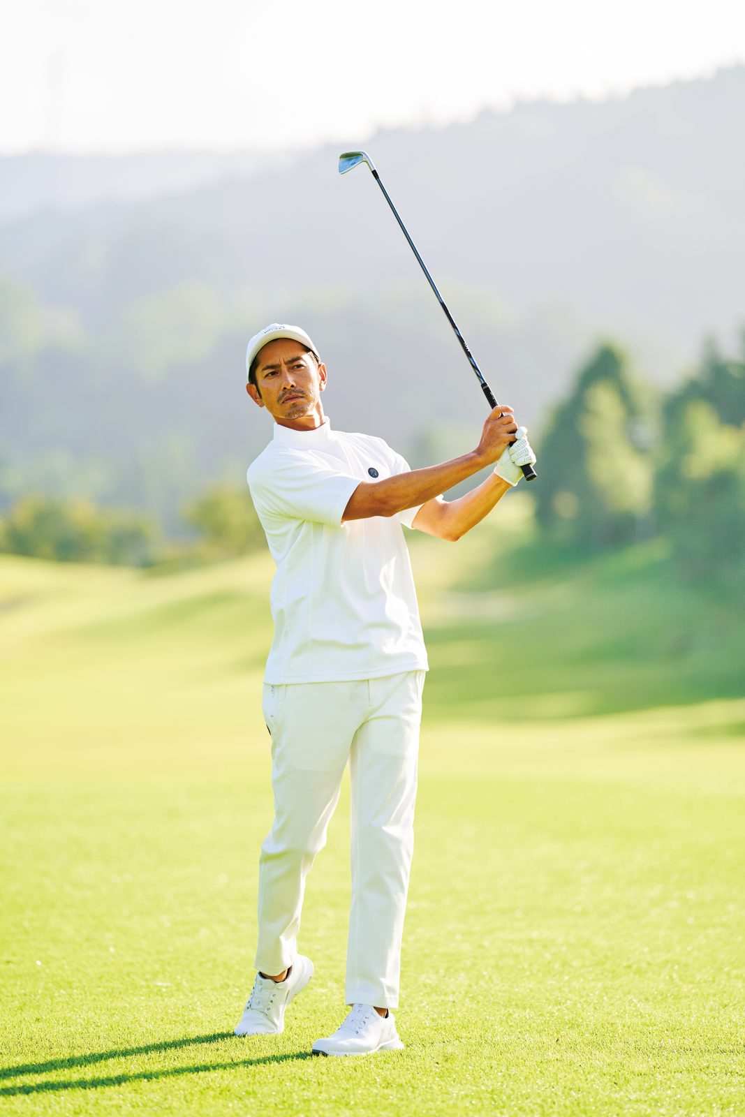 上下のトーンの違いをいかした白グラデーションが新鮮。モックネックや袖口は厚みがあり硬めな編み立て仕上げで汗をかいてもヨレにくい。タイトすぎないシャツ、腰回り緩めのテーパードパンツ、モダンシルエットもブランドの強み。キャップ:6,050円、半袖モックネック:15,180円、パンツ:25,850円(すべてWNGB)、その他スタイリスト私物。