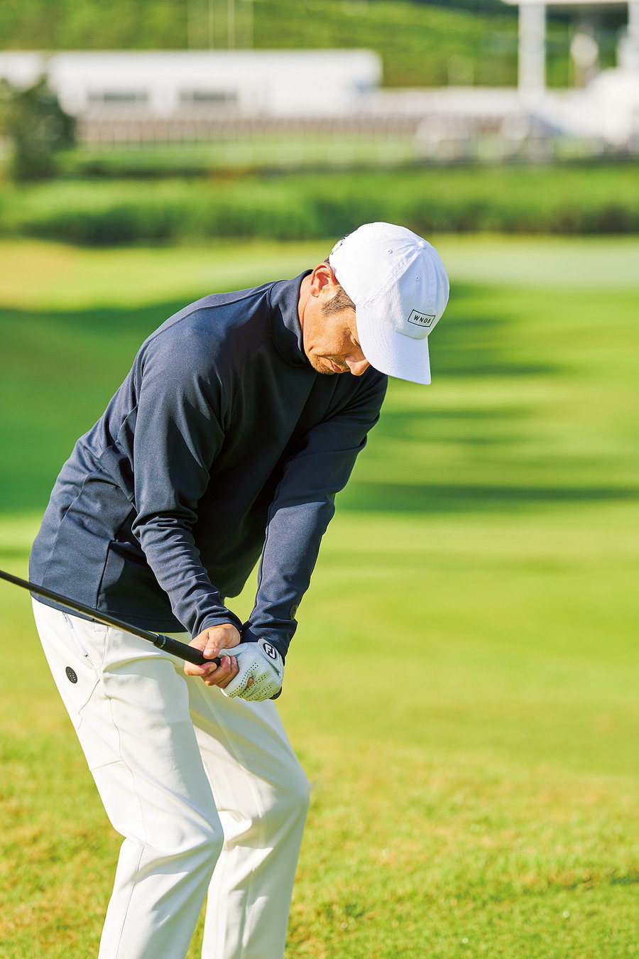 アイテム同士の組み合わせを考慮した基本配色なのでラウンド時のコーディネートに迷わない。長袖モックネックは吸水速乾、ストレッチの他、指抜きもあり、トップスはもちろん、冬場のインナーとしても活躍する。キャップ:6,050円、長袖モックネックシャツ:17,380円、パンツ:25,850円(すべてWNGB)、その他スタイリスト私物。