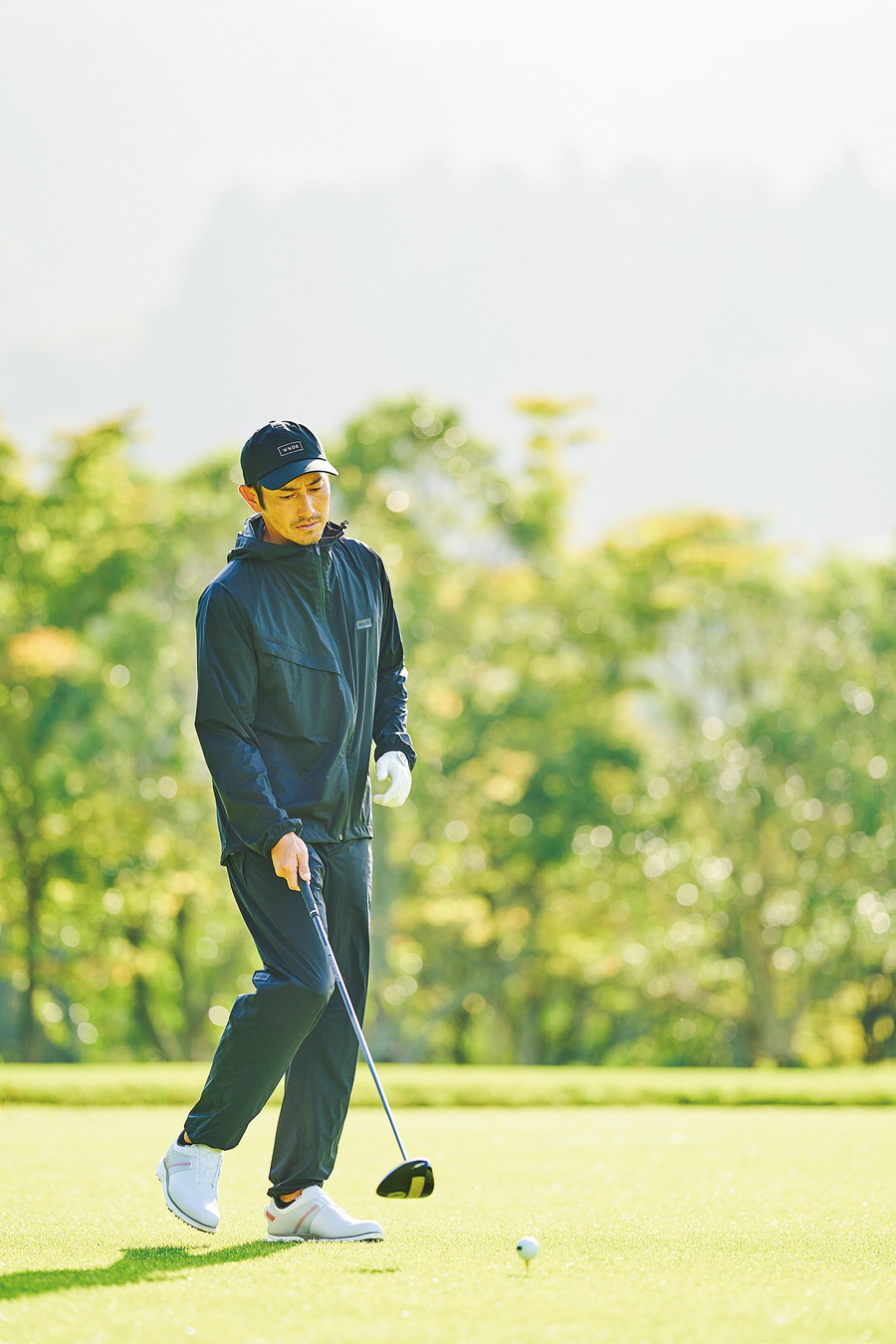 ポロシャツの袖口とキャップ、パンツの背面に控えめトーンで刻まれたロゴ以外、オールブラックの漆黒コーデは、流行や世代、着用するロケーションを選ばない万能コーデ。飽きずに長く着られるものを、というサステナブルな思いも込めている。キャップ:6,050円、ポロシャツ:17,380円、パンツ:25,300円(すべてWNGB)、その他スタイリスト私物。