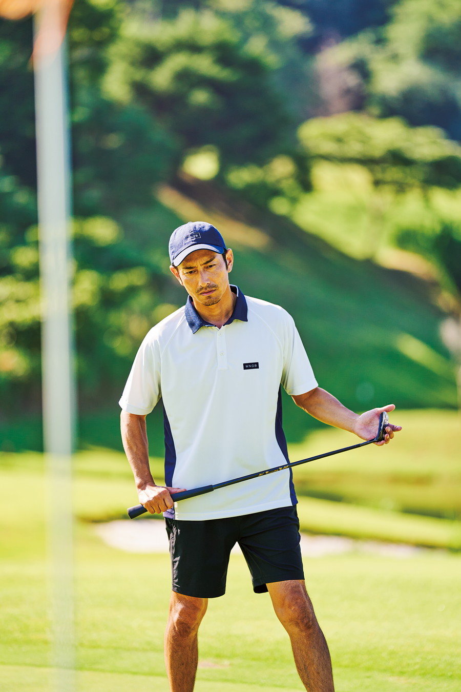 基本色にモノトーン以外で唯一採用されたネイビーは、カジュアルなショーツスタイルに華やかさや上品さをプラス。身頃で切り返したデザインは機能性の他、スタイルアップにも貢献。ショーツは速乾素材のドライなタッチ。キャップ:6,050円、ポロシャツ:14,300円、ショーツ:23,100円(すべてWNGB)、その他スタイリスト私物。