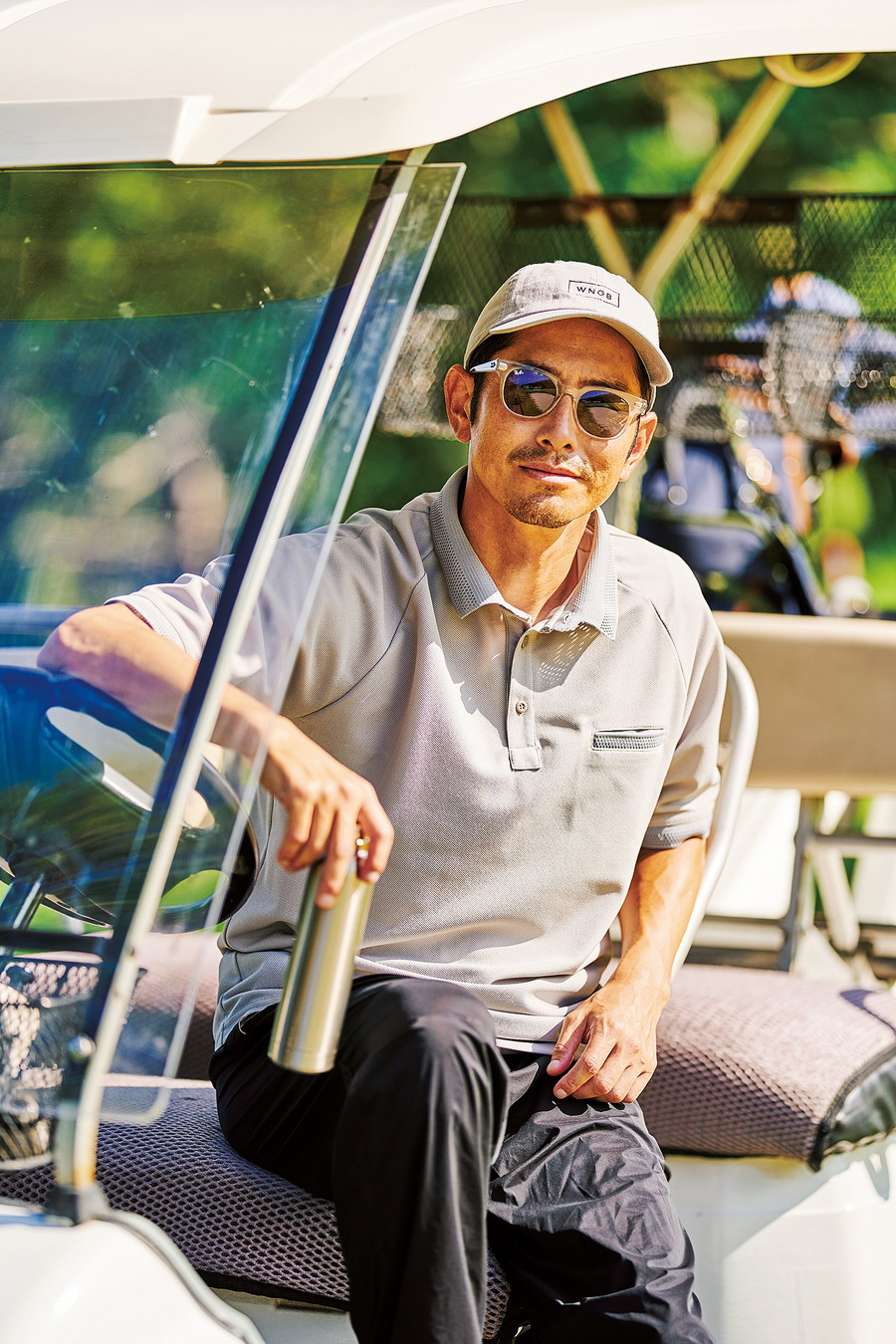 コーデの基本となるポロシャツやキャップは4色で展開。今季の白眉、ポケット付きポロシャツは素材感のあるポリ鹿の子、編み立てメッシュの台襟で汗をかいてもすっきりな上品さながら、ラグランスリーブなどスイング動作を考慮した機能性。キャップ:6,050円、ポケットポロシャツ:15、400円、パンツ:25、300円(すべてWNGB)、その他スタイリスト私物。
