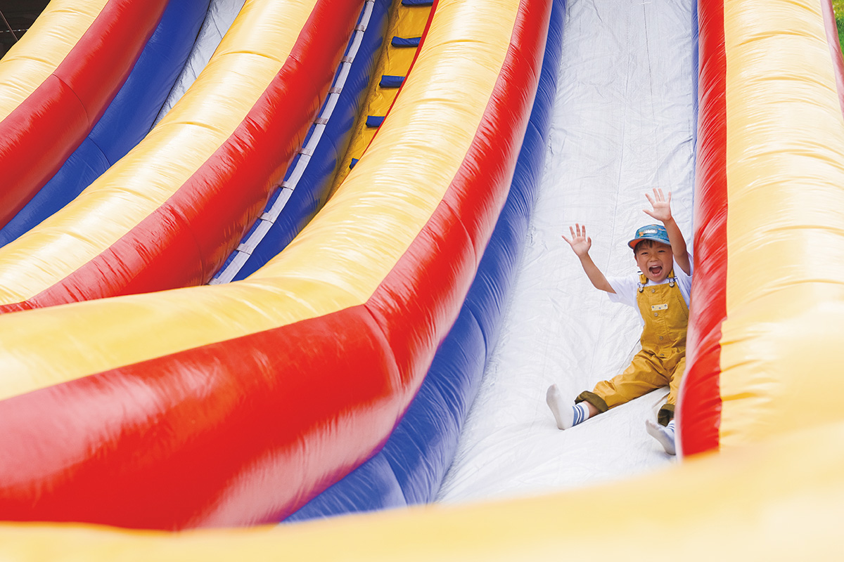 ふわふわの巨大すべり台。空気でふくらんだ柔らかい素材なので、スピード感はあるけれど安全。親子でいっしょにすべって楽しむ姿も多数。