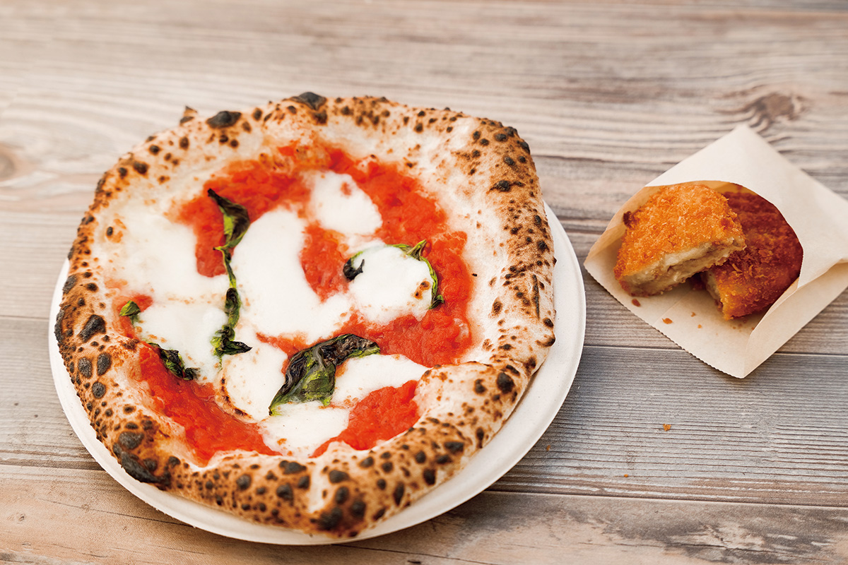 イタリア産小麦100%使用のナポリピッツァ。能登復興支援メニューの能登牛コロッケも美味。
