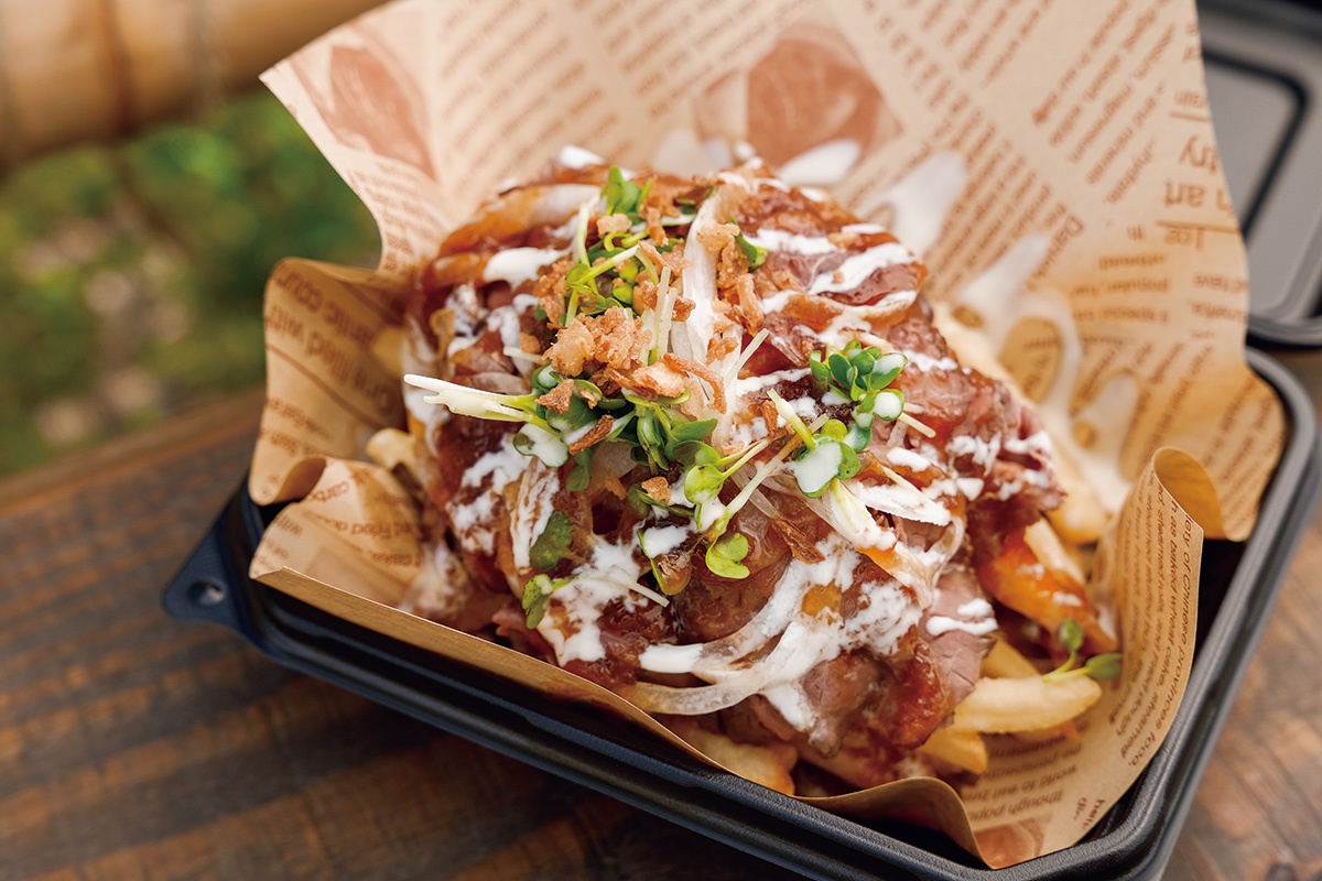 フライドポテトの上にローストビーフと新玉ねぎをトッピングした「ローディットフライ」。