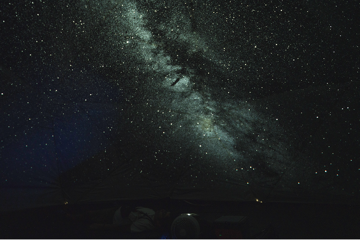 満天の星を観賞できるプラネタリウムテントが登場! 星のソムリエ・猪俣慎吾さん解説のもと、仰向けになって星空観賞。