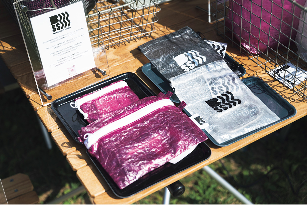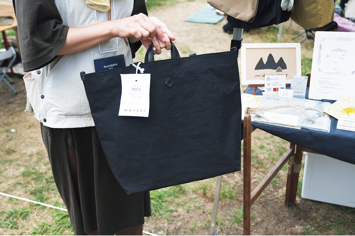 バックパックやポットなどを展示・販売。ブランドの独自素材、アズテックの残反を使うアップサイクルワークショップも。
