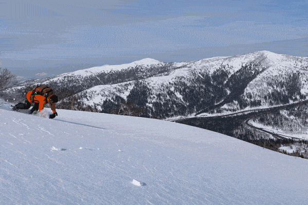 日勝峠は楽しかった。厳冬期は強い風と厳しい寒さで知られる山だが、春が近づいているせいかピリピリした緊張感もなく、僕らはおじさんギャグを連発しながら順調に高度を上げた。疎林で右も左も広いオープンバーンだ。日照と融雪が繰り返されて、いい感じのザラメ雪に仕上がっている。国道のすぐ脇からこんな斜面に入れるならそりゃあ「朝メシ前」に来たくもなるだろう。