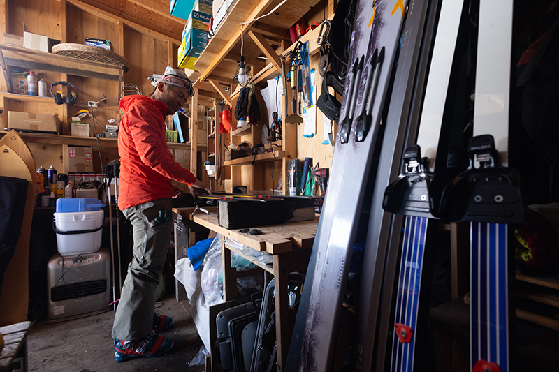スキールームでお気に入りの板にワックスを入れる石橋仁。ここではスキーはたんなるスポーツ用品ではなく、生活のためのライフツールなのだ。