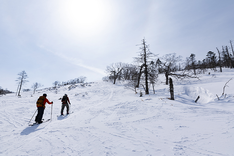 日勝峠から日勝ピークまで疎林の中を登高する。煌めくザラメが早く滑れと僕らをかき立てる。