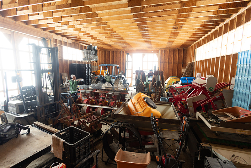 すべてひとりで作りあげたというガレージ(格納庫)では、トラクターや農耕具たちが春の出番を待ち構えていた。