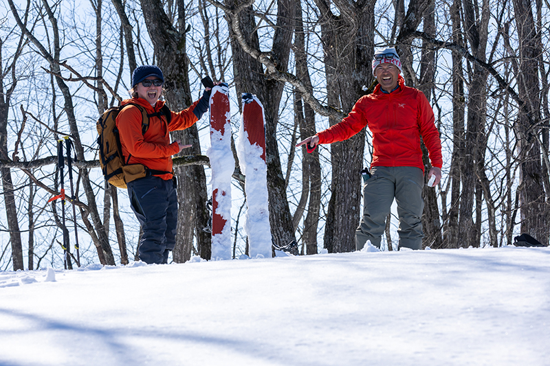 そのあとはそれぞれが思い思いのラインで春の斜面を楽しんだ。ヤバかったのは頂上直下だけで、あとはよく走る気持ちの良い雪だった。脳みそが溶けるようなスペシャルなコンディションではなかったけど、それでも「うひょー!」と声が出た。目尻が下がった。口角が上がった。滑れさえすれば、けっきょく、笑顔しかない。