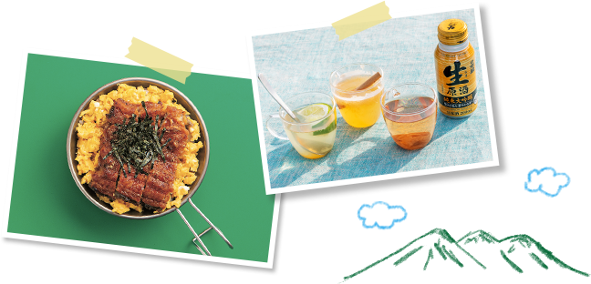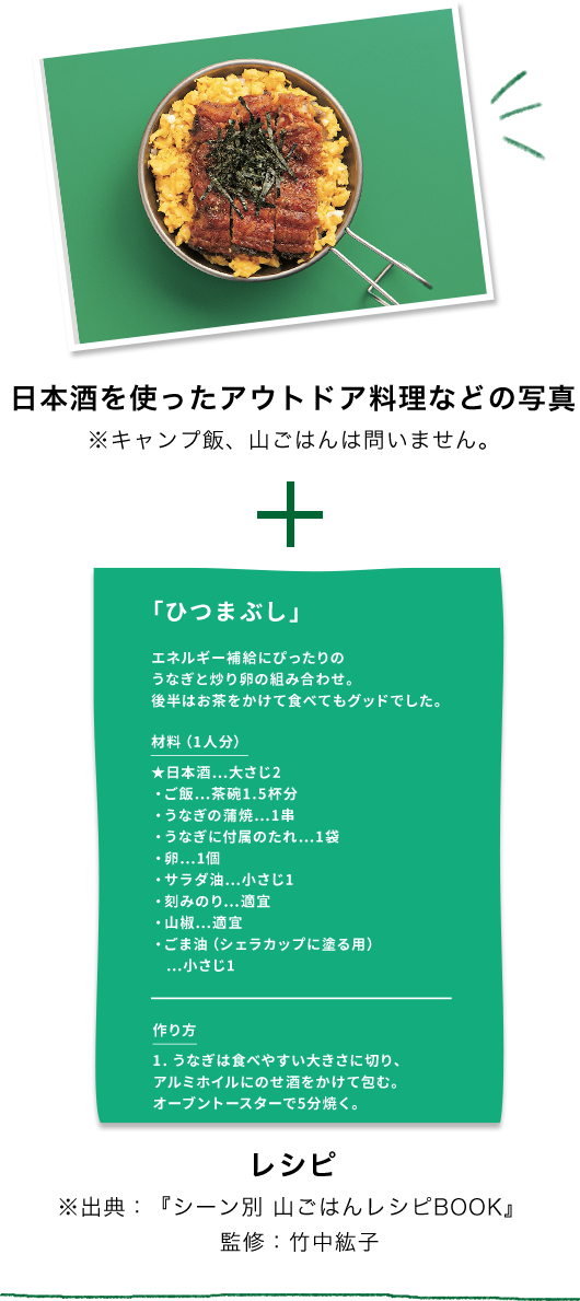 「日本酒にあうアウトドアおつまみ」「日本酒を使ったキャンプごはんや山ごはん」「外で飲みたい、冷やした日本酒カクテルや熱燗を使ったホットカクテル」のいずれかにあてはまる写真・レシピ・料理名(カクテル名)
